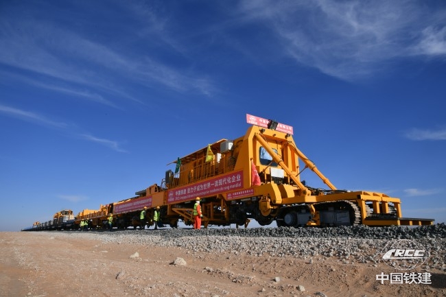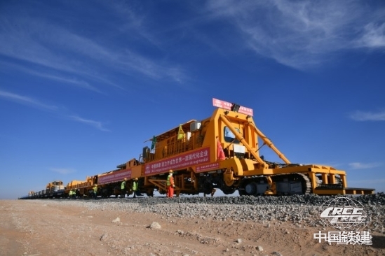 為攻克難題,項目團隊創新采用“機械化集群作業+智能監測”施工模式,投入70余臺(套適配沙漠環境的專用施工設備,推行24小時雙班鋪軌循環作業,成功創下單日最高4.225公里以及日均鋪軌3.5公里的沙漠鐵路施工紀錄。